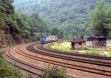 CR 6660 (ex-EL 3675) and SDP-45 6691 (ex-EL 3660) run light down the hill to begin their next pushing operation in July, 1978.