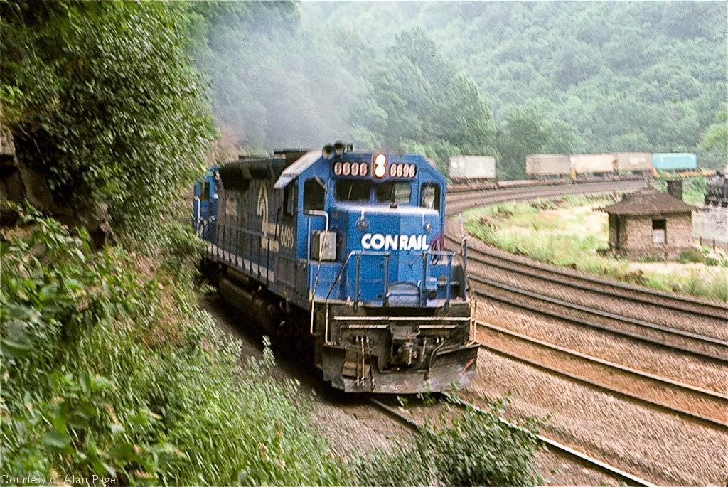 The ground was shaking as CR SDP-45 6696 (ex-EL 3665) pounded by with a TV train at Horseshoe Curve in July, 1978.