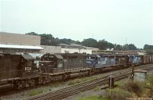 A ground shaking rumble in Harrisburg revealed 10 CR units pulling freight on a dark July, 1977 day! Here, SD-40 6288 (ex-CNJ 3064), SDP-45 6696 (ex-EL 3665), GP-38 7806, and SDP-45 6697 (ex-EL 3666) pass by.