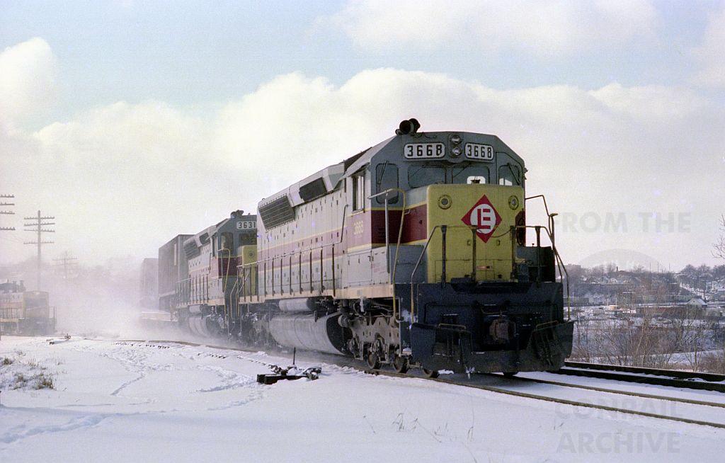 Running out it's last two months as an EL unit, SDP-45 3668 would become Conrail's highest numbered SDP as the 6699. Shown on a cold February 1976 day in Akron, note the pup getting dusted off to the left. It's in the clear for this e/b on the ACY transfer. All track is gone now, and it's hard to tell a railroad even ran in this spot.