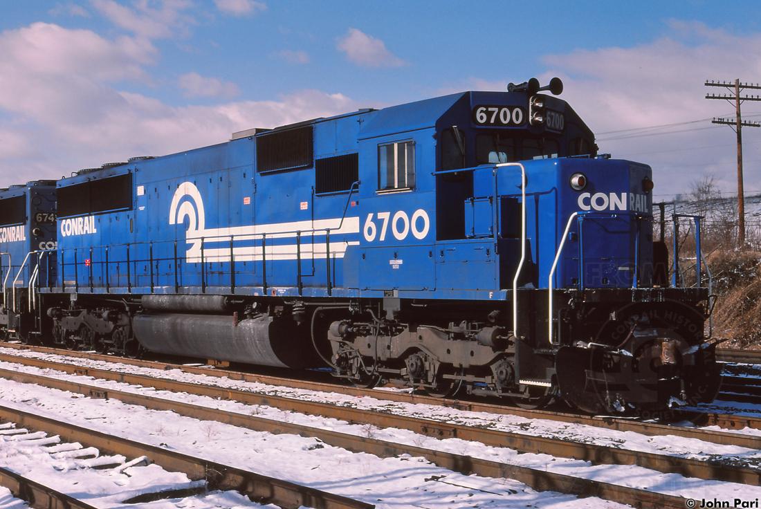 CR 6700, Conrail's first SD50, idles at Rutherford, PA on 1/12/1985.