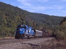 SPL275, a test train with a dedicated consist, made a number of trips over the Boston Line back in 1985 to test dynamic braking. This was one of the trips, seen at Huntington, MA. on Oct. 6, 1985.