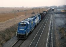 Conrail painted a few locomotives in special schemes over the years, and a pair of them were eastbound on the Reading Line in 1992. SD50 6707 was painted with a giant yellow ribbon in support of the troops and 6726 was painted for an Olympic bike trial held in Altoona. Passing Wimpey Minerals at Millards near Annville, a one-of-a-kind consist brightened an otherwise dreary day. Don Kalkman photo with permission