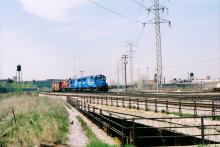 We are at Ogden Junction, a west side hotspot where transcontinental traffic changes hands. Run-through Conrail power(CR 6713, CR SD50, and EMDX 7024) is about to leave the UP Rockwell Sub for home rails in May 1995. The CSX Blue Island Sub bridge over Ogden Avenue is in the foreground, while the former PRR Panhandle once occupied the area at left. Doug Davidson photo with permission
