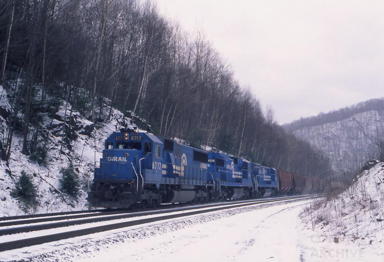 SD50 6717 heads SEBO just east of MP 130 in Becket, MA. on March 19, 1992.