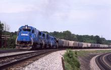 An eastbound Conrail unit grain train climbs upgrade at Gallitzin, PA on June 15, 1985, led by SD50 No. 6721.