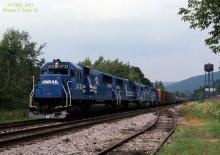 Conrail SD-50 #6733 leads a westbound at Susquehanna, PA. August 5, 1985.