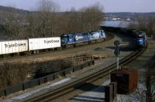 Pittsburgh Line - Marysville, Pennsylvania, USA January 03, 1999 C40-8W 6241 on RR262 The Roadrailer rolls onto the Rockville Bridge eastbound, passing a westbound work train during Conrail's final year. It was quite enjoyable to photograph colorful locomotives. Sigh...