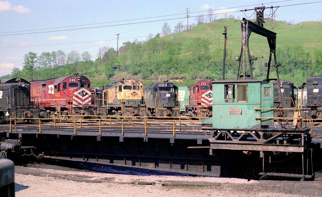 What a circle of power this day around the Conway turntable. Lehigh Valley and Reading Lines centuries rub elbows with a variety of Penn Central units. Conrail is only 2 months old and the control cab for the turntable is still sporting it's "PC" logo. LV C-628 #640 would eventually get a coat of blue.