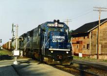 Conrail SEBR-1 with 6737 on the point at Waterloo, IN on May 31, 1996. SEBR was an experiment to see if the train got to Chicago faster by avoiding Elkhart yard. It didn't work out and was resymbolled SEEL again a few months later.