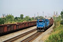 A westbound Conrail freight from Buffalo behind SD50 No. 6740 on the Chicago Line, passing an empty ore train at Cleveland, OH on Aug. 24, 1991. Doug Davidson photo with permission