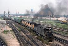 Eastbound grain has Penn Central Alco C628 # 6302 and Reading Lines C630's 5301 and 5305 for power at Collinwood on a muggy August 1976 day. PC 6302 would become CR 6740, the two RDG's would become 6754 and 6758.