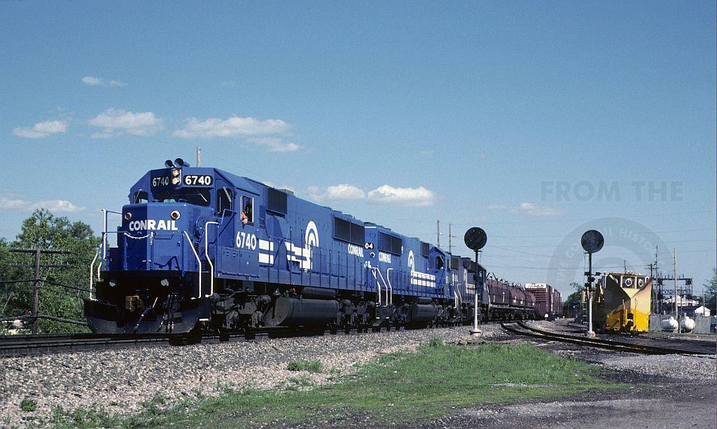 A clean SD50 pair leads westbound at Hudson, Ohio in June 1984. A Jordan spreader rests on the Carr Bros track and a local with a black GP38 is off in the distance on the eastward siding. That's the east leg of the wye to the Akron Branch curving off to the right.