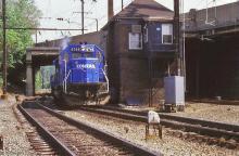 Conrail SD50 6746 is seen heading north into Enola Yard past DAY tower in 1986.