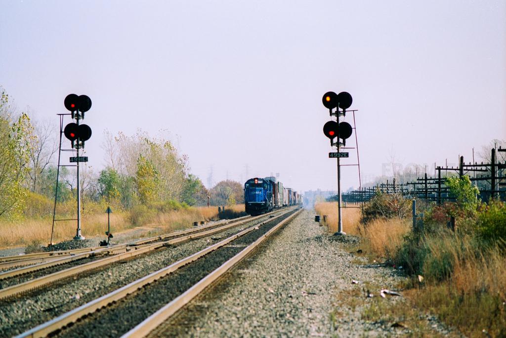 A westbound freight on Conrail's Chicago Line (former NYC) approaches the Clark Road grade crossing and MP 499 signals on the far west side of Gary, IN in October 1994. Since these are intermediates, there is apparently an eastbound train off in the distance that still hasn't cleared the block yet or that signal would be green instead of yellow. Doug Davidson photo with permission