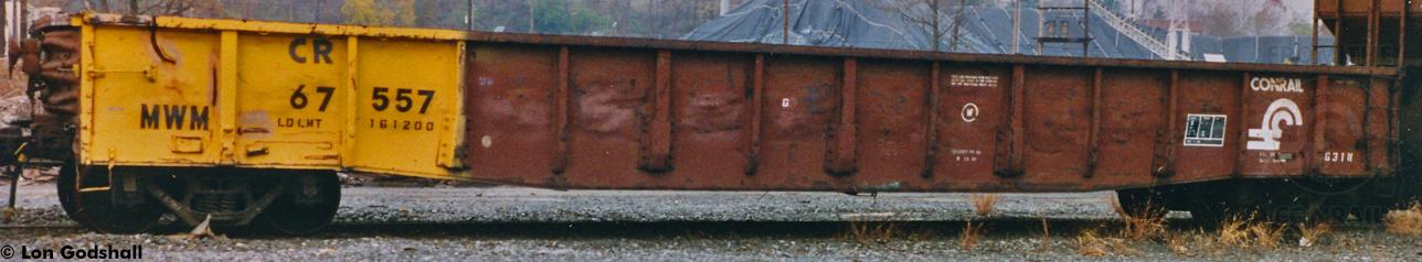 Previous Next Photo By Lon Godshall Seen here in 1998. Car is ex CR 5?????/PRR 376599. Equipment Type Class G31N Conrail Number 67557 Collection CRHS Conrail Photo Archive Contributions