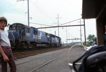 Big Alcos were rare in Philly, and even rarer on Amtrak's Northeast Corridor. Conrail C-630 #6769 is the second unit on a westbound passing the station at Frankford Junction, Philadelphia, Pa. 5/30/1979.