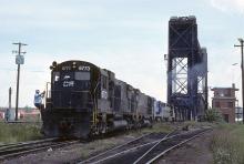 A set of 4 units, Alco C630 6773, C628 6749, a U33C, and SD45-2 6666 back down the north to Whiskey Island to tie on to their train. Bridge 1 and drawbridge tower are behind the power, and that's the B&O curving away to the right behind DB. 6773 came to Conrail as Penn Central 6323.