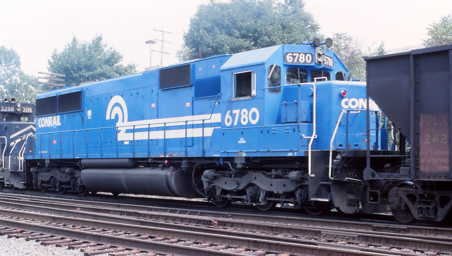 CR 6780 is pictured trailing on a westbound Conrail freight at Belt Line Jct, Reading, PA, on 8/13/88.
