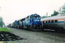 An eastbound Conrail freight with the 6787 on the point passes Amtrak 49, which is stopped at the station, at Waterloo, IN on May 23, 1999