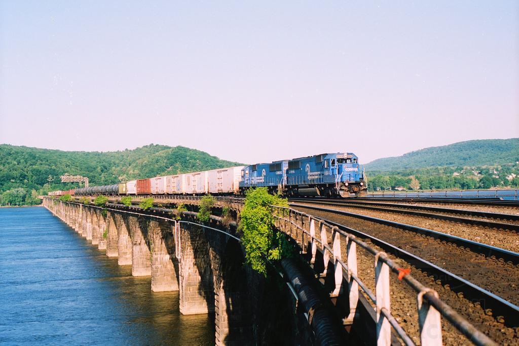 A pair of Conrail SD60s, Nos. 6844 and 6856, lead an eastbound freight across the Rockville Bridge, in May 1996. Doug Davidson photo with permission