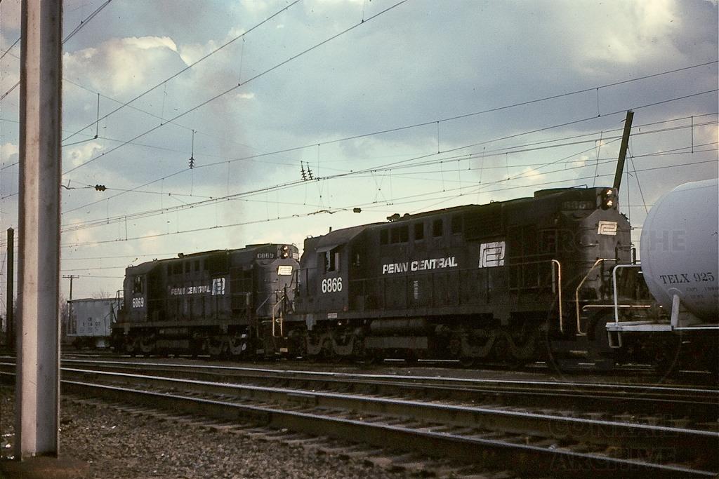 Late in the day, and late in their lives, sister RSD-12's 6866 and 6869 work the yard at Morrisville in March, 1977. The Alco RSD-12's at Morrisville will last for only a few more weeks. RS11's were working the yard the end of April. The classic sound of Alco 251B prime movers would be gone by the end of 1977, when GP30's took over the yard work.