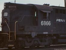 A view into the cab of PC RSD-12 6866, late in the day at Morrisville in March, 1977.