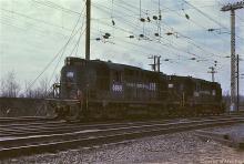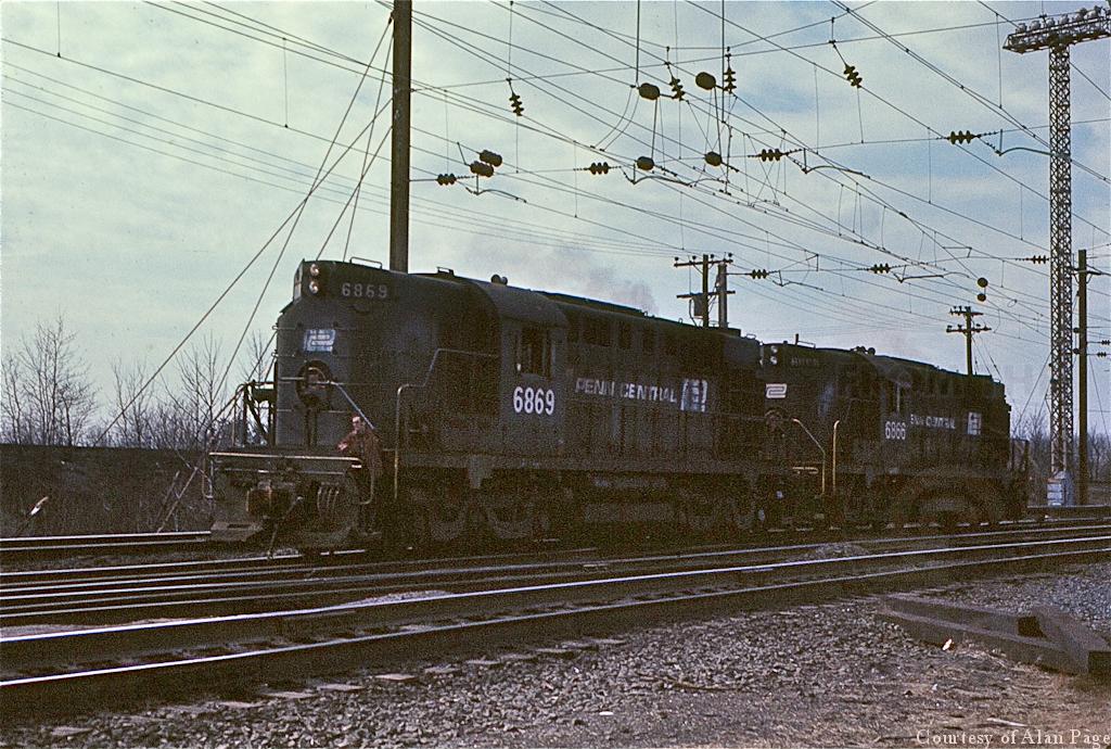Near their last days, sister RSD-12's 6869 and 6866 work Morrisville yard in March, 1977.
