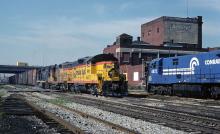 Conrail got to rub elbows with some pretty interesting railroads during it's life span, and the Chessie System was one of them. Here Conrail train MECI waits to go west on the former EL while a Chessie eastbound with Western Maryland GP-9 6401 passes on the joint CR/B&O Warwick to Akron line. CR U33C 6872 is a former Erie Lackawanna unit on home rails, but that WM chop nose geep is far from the WM. Today CSX still uses the tracks the Chessie train is on, the EL is long gone.