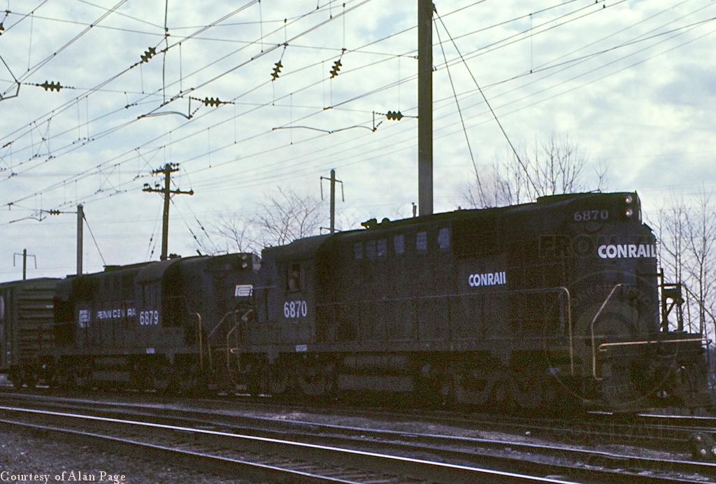 A pair of worn Alco RSD12's, 6870 and 6879, work Morrisville in March, 1977. The Alco 251B prime movers still sounded great even though they were just weeks from retirement.