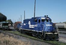 Conrail SD39 6937 and MT6 1107 work the RIP track in Allentown, Pa on a nice April 1998 evening.The SD started life on the Penn Central, the slug is former PRR/PC/CR RSD-12 6869.