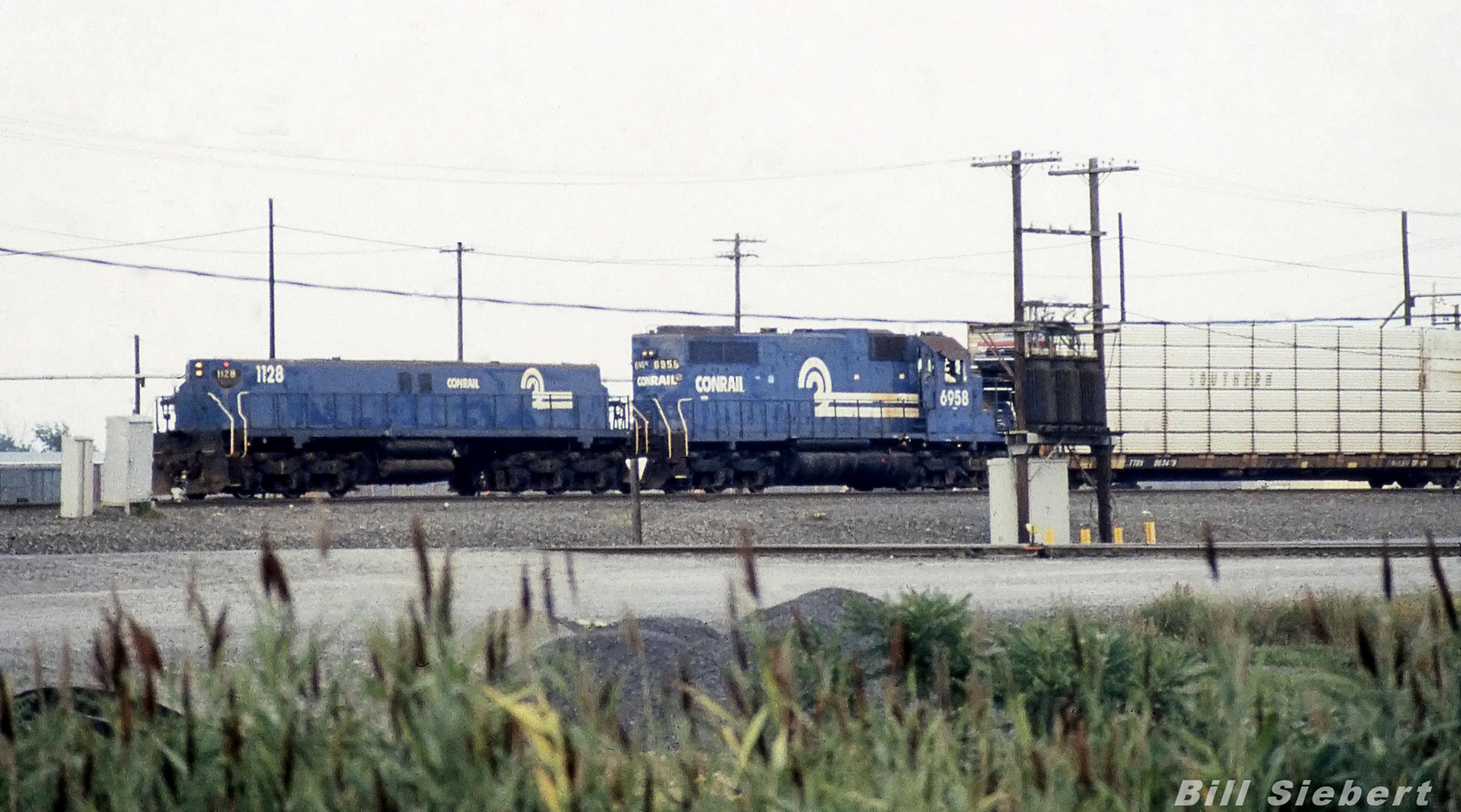 Mother and slug set SD38 (6958) and MT 6 (1128) push a string of cars up the hump at Selkirk yard in 1990.