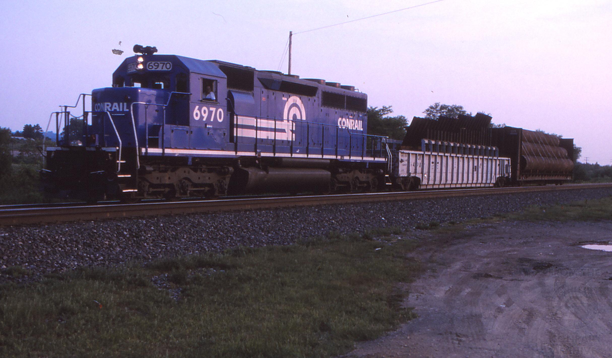 Previous Next A single SD40 rebuild takes two cars east out of the gathering gloom, heading for Buffalo with a car of pipe and a car of panel track. Photo By Tom Beckett Year 1996 Original Date 6/16/96 Equipment Type EMD SD40-2R Conrail Number 6970 Additional Galleries Tom Beckett Line or Locale Conrail's Chicago Line Collection CRHS Conrail Photo Archive Contributions
