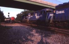 After Conrail single tracked the Tier west of Waverly, that town became a frequent meet point. This afternoon is a case in point. We see eastbound BUBI, a short turn out of Frontier with Binghamton cars, meeting CP 557, behind SOO 768/CP 1837, the trailing unit an RS18u. He got stabbed badly here, having to wait for, in order, CP 252, at that time a stack train that ran from Buffalo to Binghamton, then getting an NYSW crew for the trip to Little Ferry; then ML 440, 78 auto racks behind CR 6709/NS 8802/CR 5556; and this 24 car train we see here. The trailing unit on BUBI, out of sight, is CR 3269.