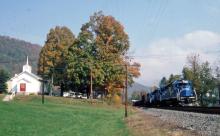 HBBU-5 is passing the classic old church at Shinntown behind SD40-2R 6981, SD40-2 6436 and SD40-2 6393. 10/1993