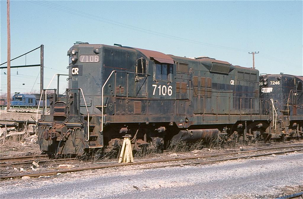 Still in PC paint at the end of her operating days, CR GP9 7106 rests in a Harrisburg deadline in April, 1984. "REW" is stencilied on her nose and a happy face has been added by her handrail.