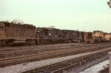 Third and fourth in line behind former PRSL GP38's 2001 and 2007, CR GP7 7157 and PC C424 2423 pause before pulling through Abrams yard in February, 1977.
