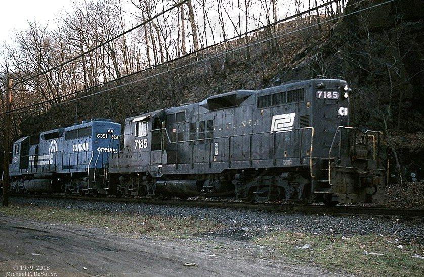 Showing all of its heritages, Conrail GP-9 #7185 Leads a westbound freight at River Road.