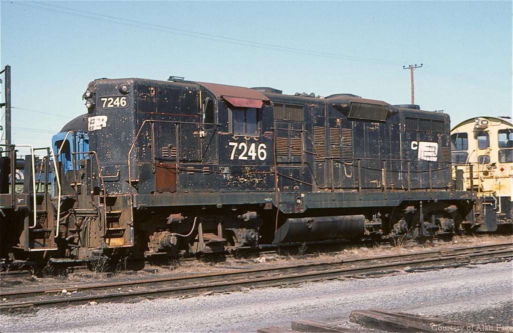 With PC still showing, CR GP9 7246 reaches the end of her operating days at Harrisburg in April, 1984.