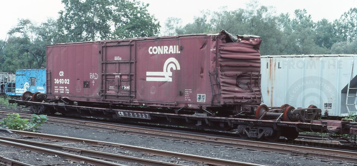 CR 725327 (ex CR 757530, built 10-62) is seen with wrecked CR 369302 (class X73, ex PC 369302, built 11-72) at Hollidaysburg, PA on 8/28/93.