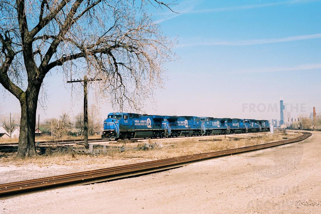 A set of Conrail light power that included 740, 753, 6170, 5532, 6443, and another GE has departed 51st Street Yard and is heading north on Metra's former C&WI main track at 47th Street, in April 1997. The power is making a relay move to 55th Street Yard, via CP 518. Doug Davidson photo with permission