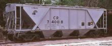 Conrail class H30 covered hopper 74008 is seen at Mt. Union, PA in 1982. In 1986 there were only a total of 7 of these sand cars in the 74xxx series. CR 74008 ex PRR 255468. Blt 5-46.Car was painted at the Hollidaysburg, PA car shops.