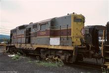 Former EL GP-9 1264 (CR 7482) shows a bent frame outside the Juniata Locomotive shops in August, 1977.