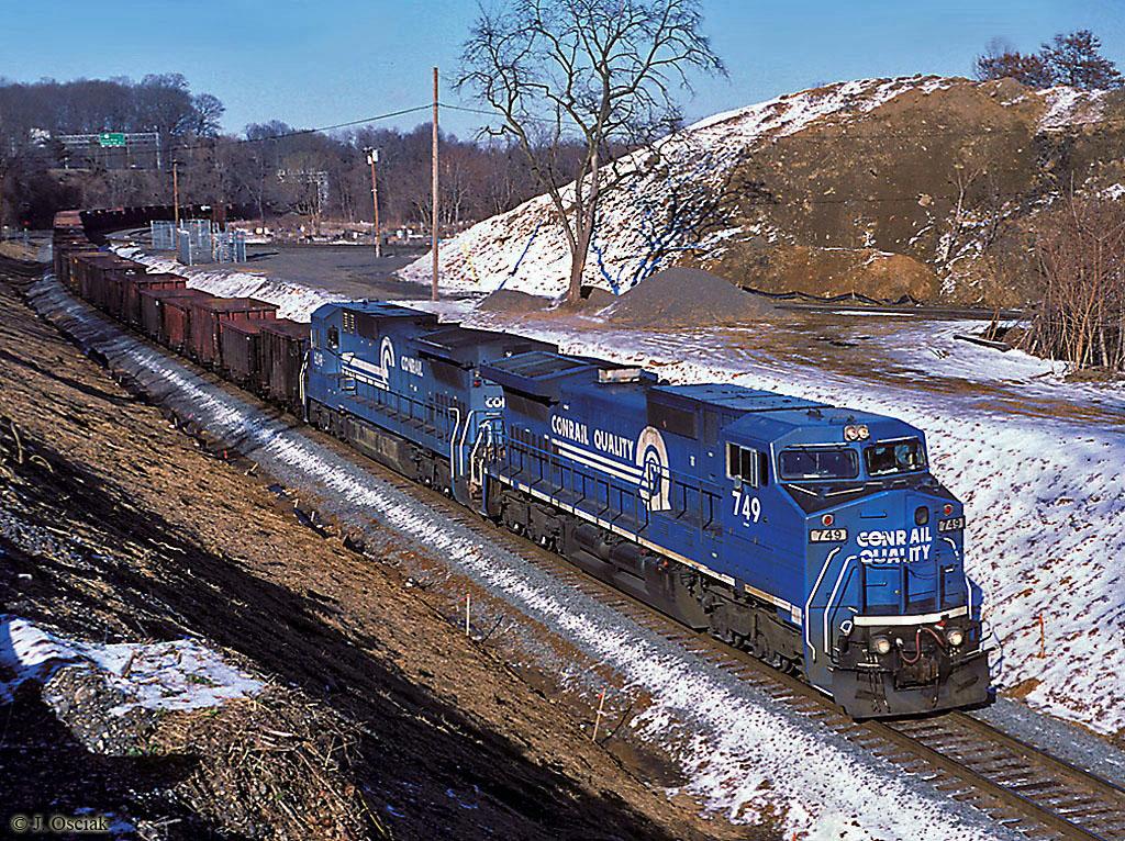 Conrail C40-8W 749 leads a XGW20 ore train past CP-Belmont in Philadelphia, PA on 3/3/1996. The train is on the new connection to the High Line, en-route to Pier 122 to be re-loaded with iron ore.