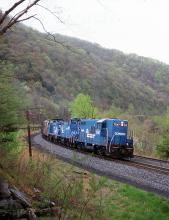 Previous Next Photo By Stanley Short Eastbound Conrail Train WHWC12 rounds a curve at Auburn, PA on April 28, 1987 with GP10 No. 7547, a MP15 and a SW1500. Year 1987 Original Date 4/28/87 Location Auburn PA Equipment Type EMD GP8 Conrail Number 7547 Additional Galleries Stanley Short's Conrail Photos Line or Locale Conrail in Hard Coal Country Collection CRHS Conrail Photo Archive Contributions
