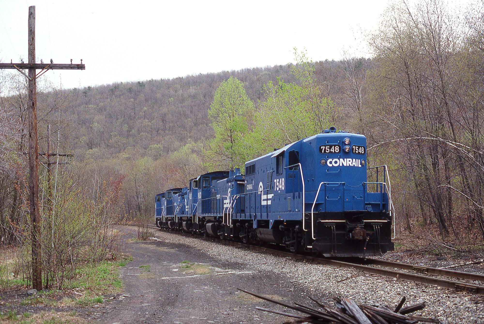 Conrail GP10 No. 7548 trails an eastbound light engine movement near Barnesville, PA on May 2, 1987.
