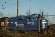 Late in the day, CR GP-10 7570 and GP-38 7756 rest at Morrisville in April, 1977.