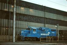 CR GP10 7571(ex-PC GP9 7512) by the service racks outside the Morrisville shops in April, 1977.