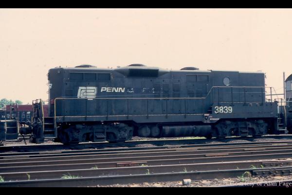 Late in the day at Morrisville yard in April, 1977, CR GP10's 7572 and 7574 pass by a line of stored, or retired, units including PC RS1 9902.