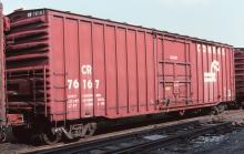 CR 76167 is seen in Rose Yard in Altoona PA on 10/5/97. Car is ex PRR 113818 and was built 3-65. Car was painted CR-BL 2-86.
